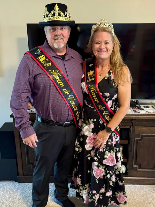 Duke Russell is the heartbeat of every party—funny, outgoing, and always ready with a joke, a toast, or a dance move that keeps the Krewe laughing and smiling. His big personality and endless energy make him impossible to miss and even harder not to love. Duchess Cristina brings grace, beauty, and sparkle to the crown. With her warm spirit and radiant presence, she perfectly balances Russell’s wild humor, adding poise and polish to every event she touches.